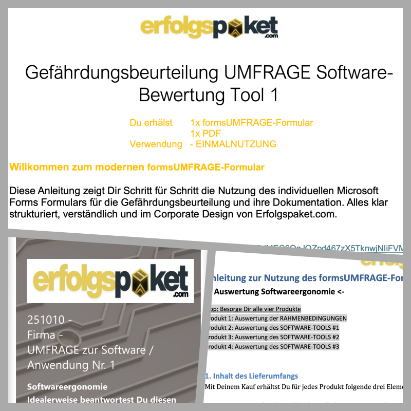Starte Deine eigene Auswertung zur Softwareergonomie mit einem professionellen forms-Fragebogen-Paket, bestehend aus einem 4-teiligen Set sofort einsetzbarer Microsoft Forms-Vorlagen zur Bewertung digitaler Arbeitsmittel – einfach, schnell und normgerecht nach Anhang 6 der Arbeitsstättenverordnung. Hiermit erhälst Du Teil 2 des 4-teiligen Sets: Bewertung des SOFTWARE-TOOL 1