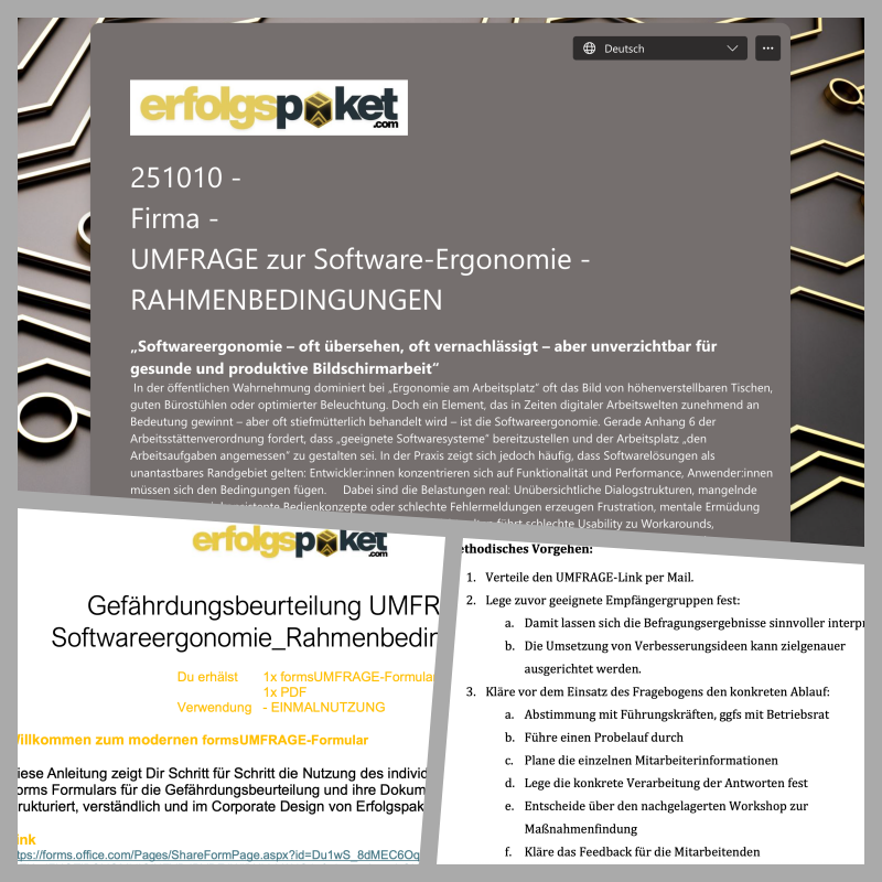 Starte Deine eigene Auswertung zur Softwareergonomie mit diesem professionellen forms-Fragebogen-Paket. Dieses Produkt ist Teil eines 4-teiligen Set sofort einsetzbarer Microsoft Forms-Vorlagen zur Bewertung digitaler Arbeitsmittel – einfach, schnell und normgerecht nach Anhang 6 der Arbeitsstättenverordnung. Hiermit erhälst Du Teil 1: Gefährdungsbeurteilung der RAHMENBEDINGUNGEN zur Softwareergonomie