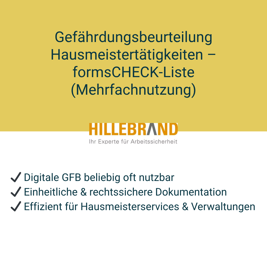 Mit der Gefährdungsbeurteilung Hausmeistertätigkeiten – formsCHECK-Liste (Mehrfachnutzung) erhalten Sie ein digitales Werkzeug, das beliebig oft eingesetzt werden kann. Die Vorlage ermöglicht eine strukturierte Erfassung von Gefährdungen, eine systematische Risikobewertung und die Festlegung von Maßnahmen. So können wiederkehrende Tätigkeiten effizient, nachvollziehbar und rechtssicher dokumentiert werden.