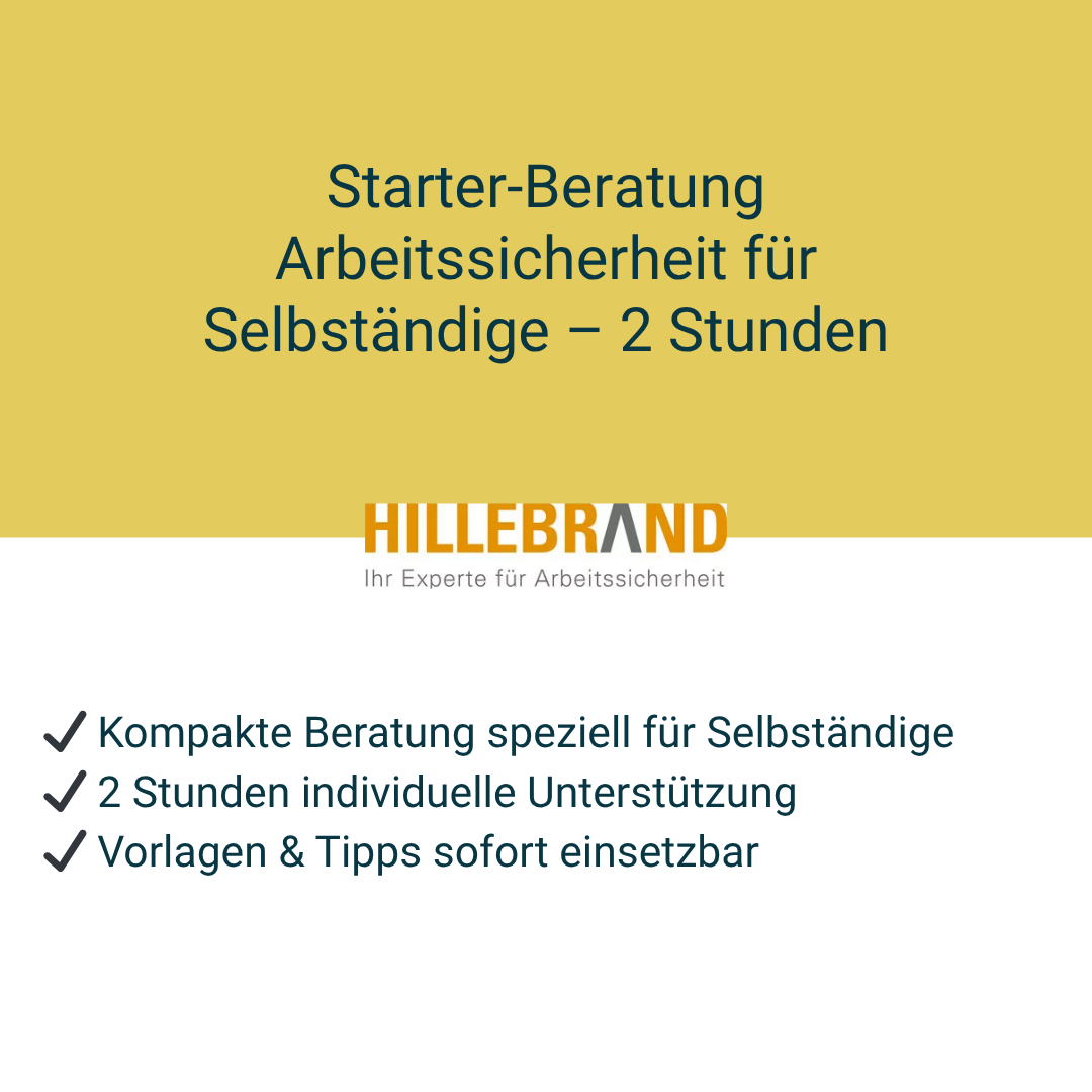 Die Starter-Beratung Arbeitssicherheit für Selbständige (2 Stunden) bietet eine kompakte Einführung, die speziell auf die Bedürfnisse von Einzelunternehmern und Freiberuflern zugeschnitten ist. Sie erhalten praxisnahe Grundlagen, konkrete Handlungsempfehlungen und direkt einsetzbare Vorlagen für eine rechtssichere Organisation.