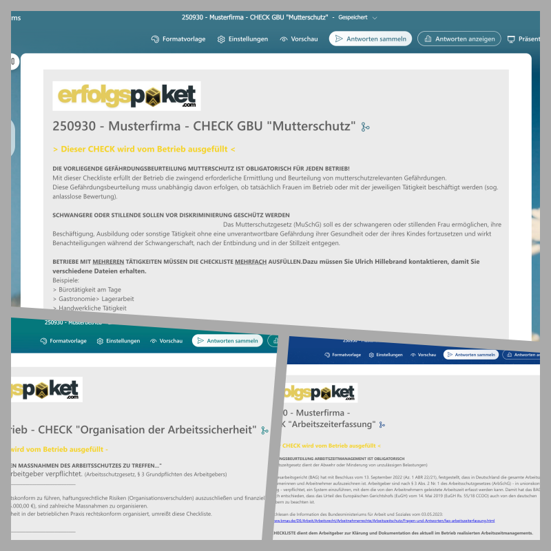 ERFOLGSPAKET #2 6er-Paket Erledige die 6 für jeden Betrieb obligatorischen CHECK-Gefährdungsbeurteilungen schnell, rechtssicher und digital – mit den professionellen formsCHECK-Vorlagen für Microsoft Forms und PDF. Einfach, zeitsparend und perfekt dokumentiert. Schnell, digital, rechtssicher – von Arbeitgeber bzw. Fachkraft für Arbeitssicherheit in nur 5–10 Minuten pro Thema ausgefüllt. Dieses ERFOLGSPAKET #2 ergänzt perfekt die formsUMFRAGE-Gefährdungsbeurteilungen aus ERFOLGSPAKET #1.