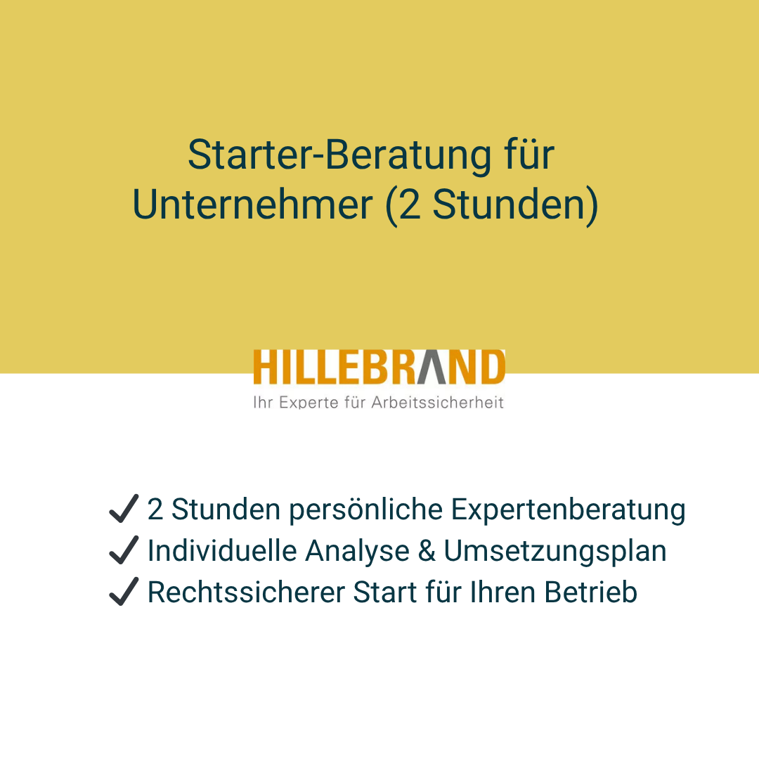 Die Starter-Beratung Arbeitssicherheit für Unternehmer (2 Stunden) bietet eine kompakte Einführung, die speziell auf die Bedürfnisse von Einzelunternehmern und Freiberuflern zugeschnitten ist. Sie erhalten praxisnahe Grundlagen, konkrete Handlungsempfehlungen und direkt einsetzbare Vorlagen für eine rechtssichere Organisation.