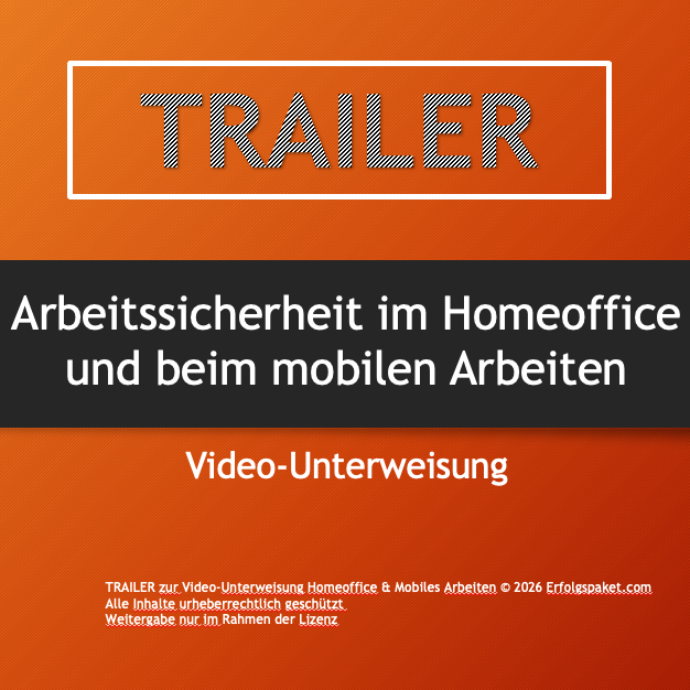 Digitales Unterweisungsmodul zur sicheren und gesundheitsgerechten Arbeit im Homeoffice und beim mobilen Arbeiten. Strukturiert aufgebaut aus Video-Unterweisung, ausführlichem Langtext, Lernerfolgskontrolle und personenbezogenem Zertifikat. Zur innerbetrieblichen Unterweisung von Beschäftigten gemäß Arbeitsschutzgesetz (ArbSchG). Interesse an diesem Unterweisungsmodul? Die Bereitstellung erfolgt aktuell im direkten Kontakt. Schreiben Sie uns gerne an info@erfolgspaket.com.